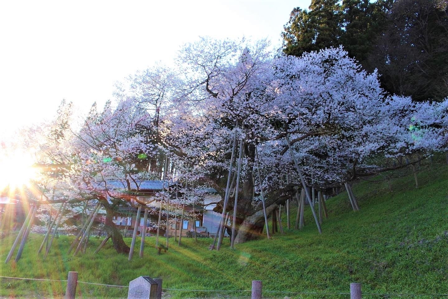 樹種はエドヒガン桜で、幹の目通りは、周囲7.3m、枝の差し渡しは東西20m、南北30mに達します。咲き始めは4月中旬から4月下旬頃ですが、気温によって前後することがあります。