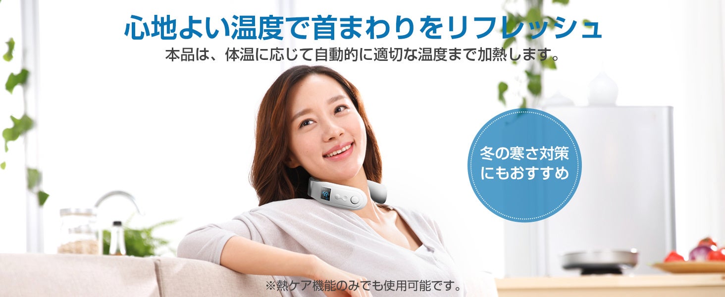 EMSとTENSが同時に作動する10種類のモードを搭載。16段階の強さ調整が可能で、お好みの強度にカスタマイズできます。加温機能は、首全体をじんわり温め、寒い日にはネックウォーマーとしても活躍。モードと温感を組み合わせた贅沢なひとときをご自宅でお楽しみいただけます。