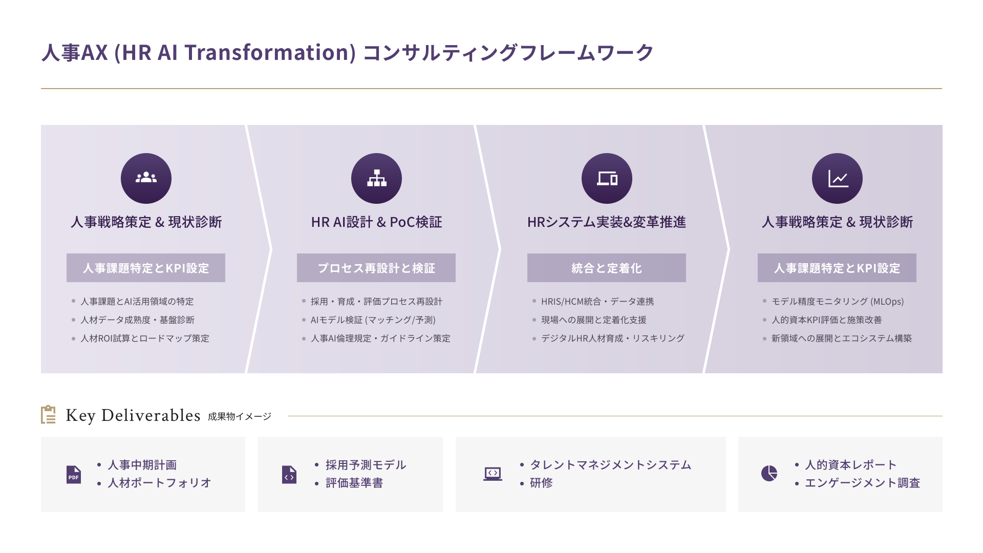 当社はこうした課題を解決すべく、人事領域におけるAX支援のためのコンサルティングの体制を大幅に強化・拡大いたします。すでに展開している人事プロフェッショナルのキャリア向上を目的とした認定資格プログラム「人事AXエキスパート(Human Resources AI Transformation Expert)」に加え、「PeopleX AI面接」「PeopleX AIロープレ」等の対話型AIサービスをかけ合わせることで、企業の競争力強化を強力に後押ししてまいります。