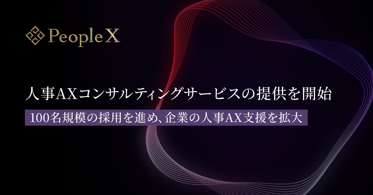 採用から活躍支援まで、AIで人事課題を解決する株式会社PeopleX(本社:東京都新宿区、代表取締役CEO:橘 大地、以下:当社)は、人事領域のAX(AI Transformation)に関するコンサルティングサービスの提供を開始することをお知らせいたします。本サービスについて部門化し、採用強化も行うことで組織拡大を進め、企業の人事AXをさらに強力に支援してまいります。
