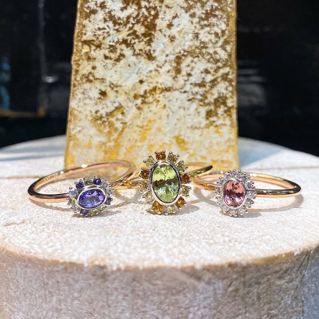 今回はリング・ピアス・ペンダントのすべてが新しい配色で登場。人気のゾイサイトやタンザナイトを使用したデザインも並びます。