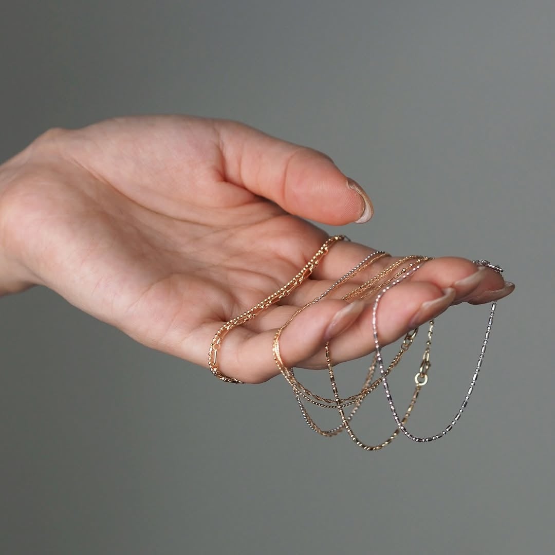 スタッドやミラーカット、プラムなど、異なるチェーンパターンを組み合わせたデザインは約20種類。1本の中で2〜3種類のチェーンを繋ぎ、ホワイトゴールドとイエローゴールドのコントラストが生む、上品な光のニュアンスを楽しめます。動くたびに反射する繊細な輝きとカットの切り替え位置まで計算されたラインが、首元や手元を美しく見せてくれます。ペンダントと重ねて“光の縁取り”として添えるのはもちろん、単体でも存在感のある仕上がりです。