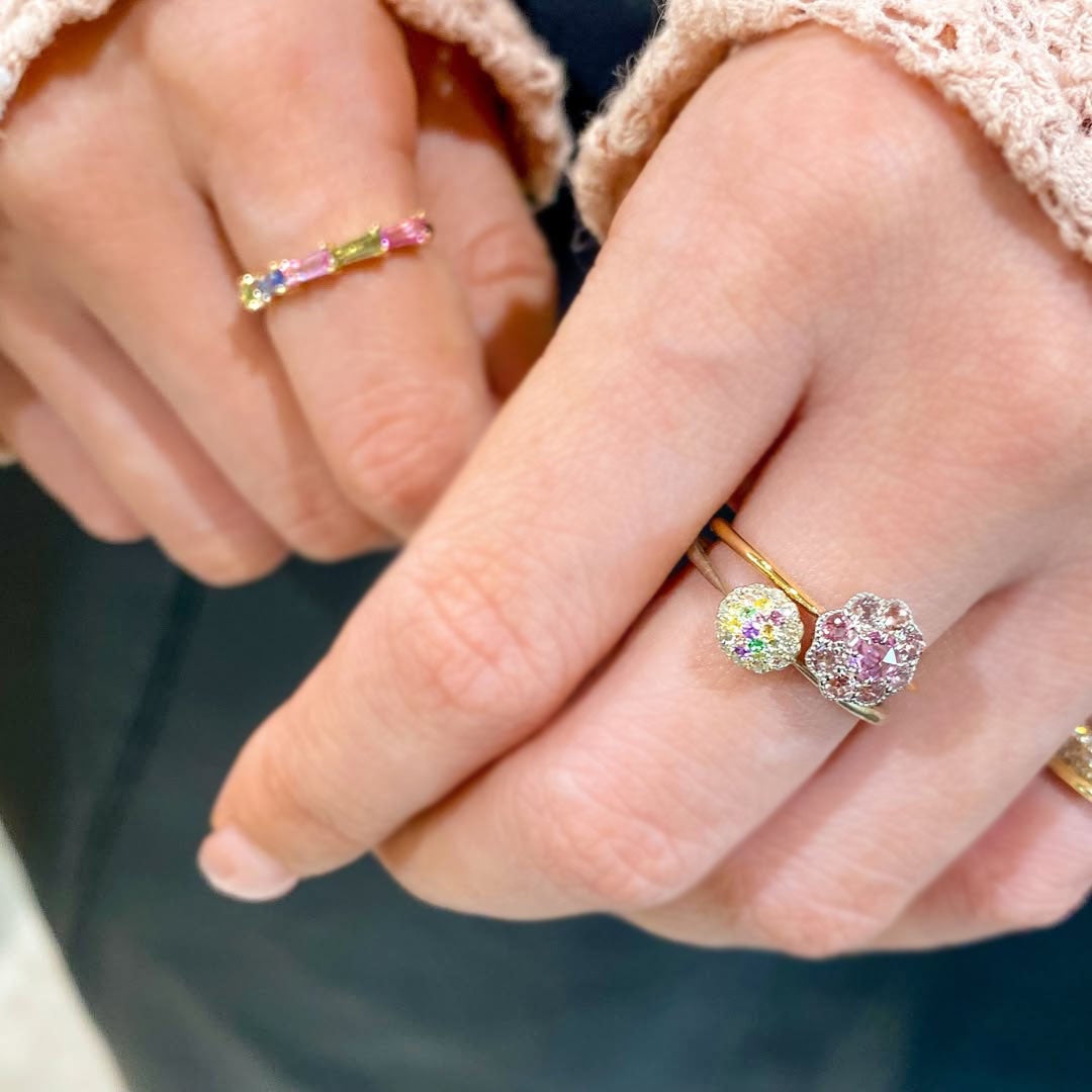 9月のPOP UP SHOPで好評を博した「テーパーカット」(宝石のカッティング法、先端に向かって徐々に幅が細くなる台形状のカット)に、マルチカラーサファイアのバージョンが新登場です。同系色やマルチカラーなど、お好みの色合わせをお楽しみいただけます。斬新なデザインながら、指にのせると上品で愛らしい印象に。
