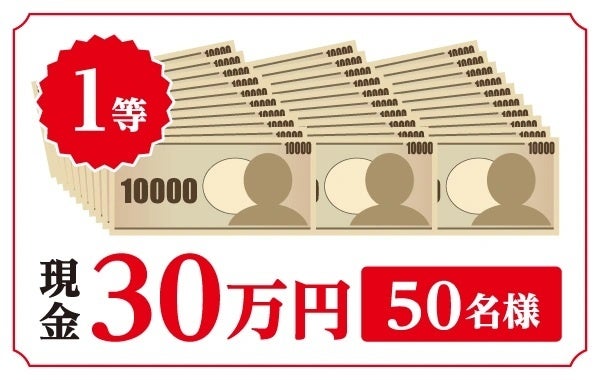 1等は50名様に30万円、2等は727名様に1万円が当たるチャンスをご用意しました。また、1等、2等以外の方全員に、もれなく30円引きクーポンをプレゼントする「ハズレなし」の企画です。