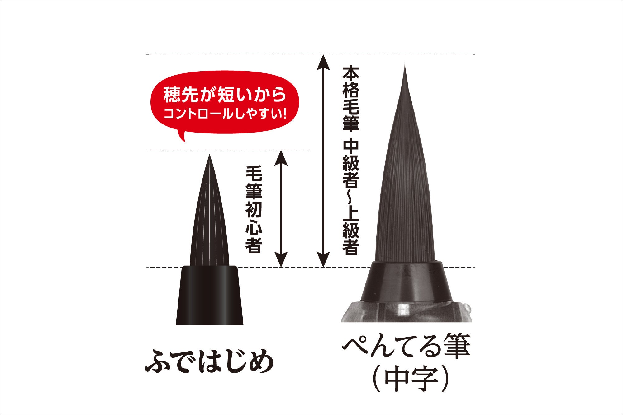 今回新発売する「ふではじめ」は、ぺんてる筆の品質はそのままに、穂先を従来より硬く、短くすることによって、コントロールしやすさを向上させた筆ペンです。ぶれにくく小回りが利き、筆ペンが苦手な人や、初めて毛筆にチャレンジする方の入門筆ペンとしても最適な1本です。
