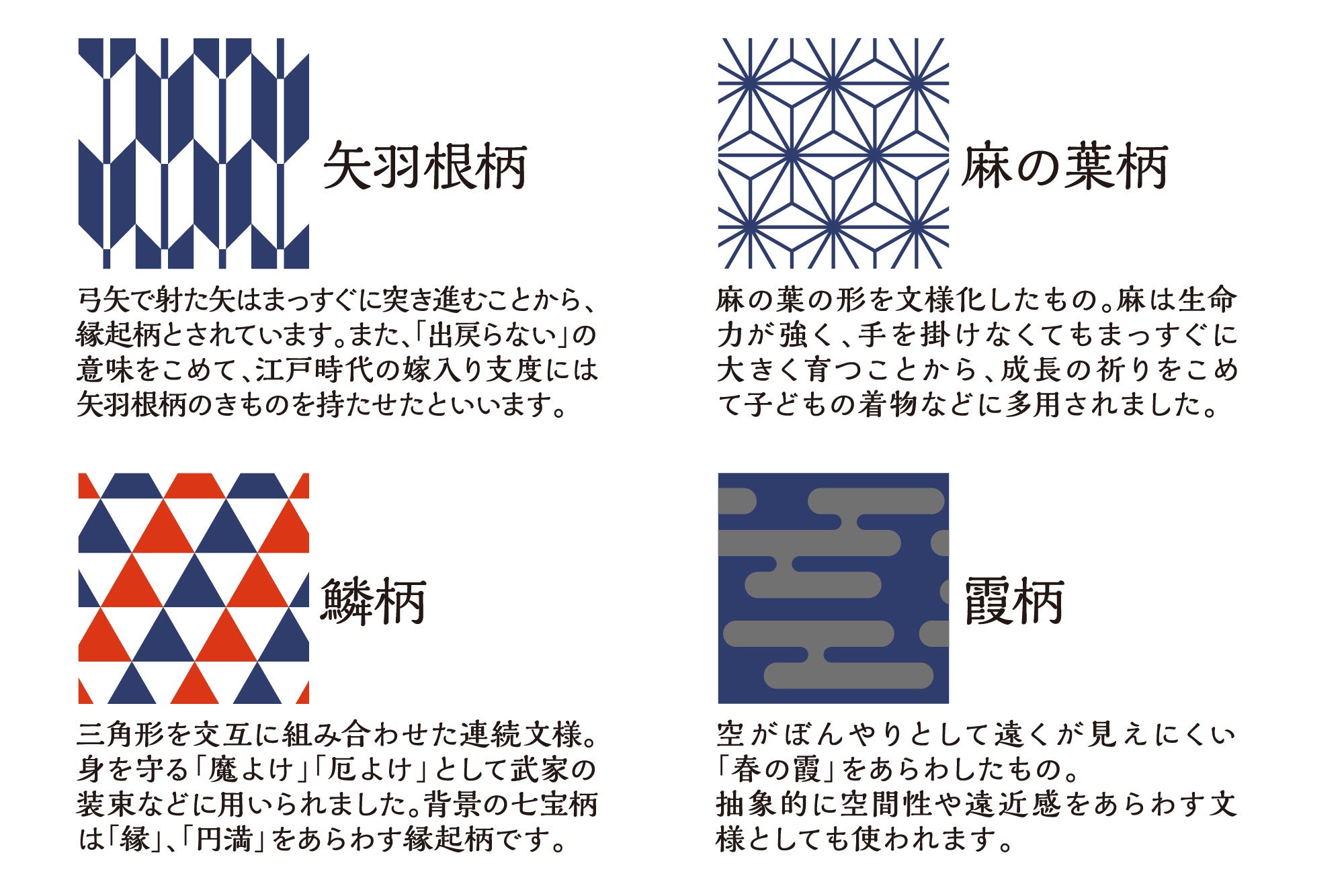 ボディにモダンテイストな和柄をデザインしました。黒インキには、縁起の良い意味を持つ「矢羽根柄」「鱗柄」「麻の葉柄」、うす墨インキには「霞柄」の計4種をラインナップしています。