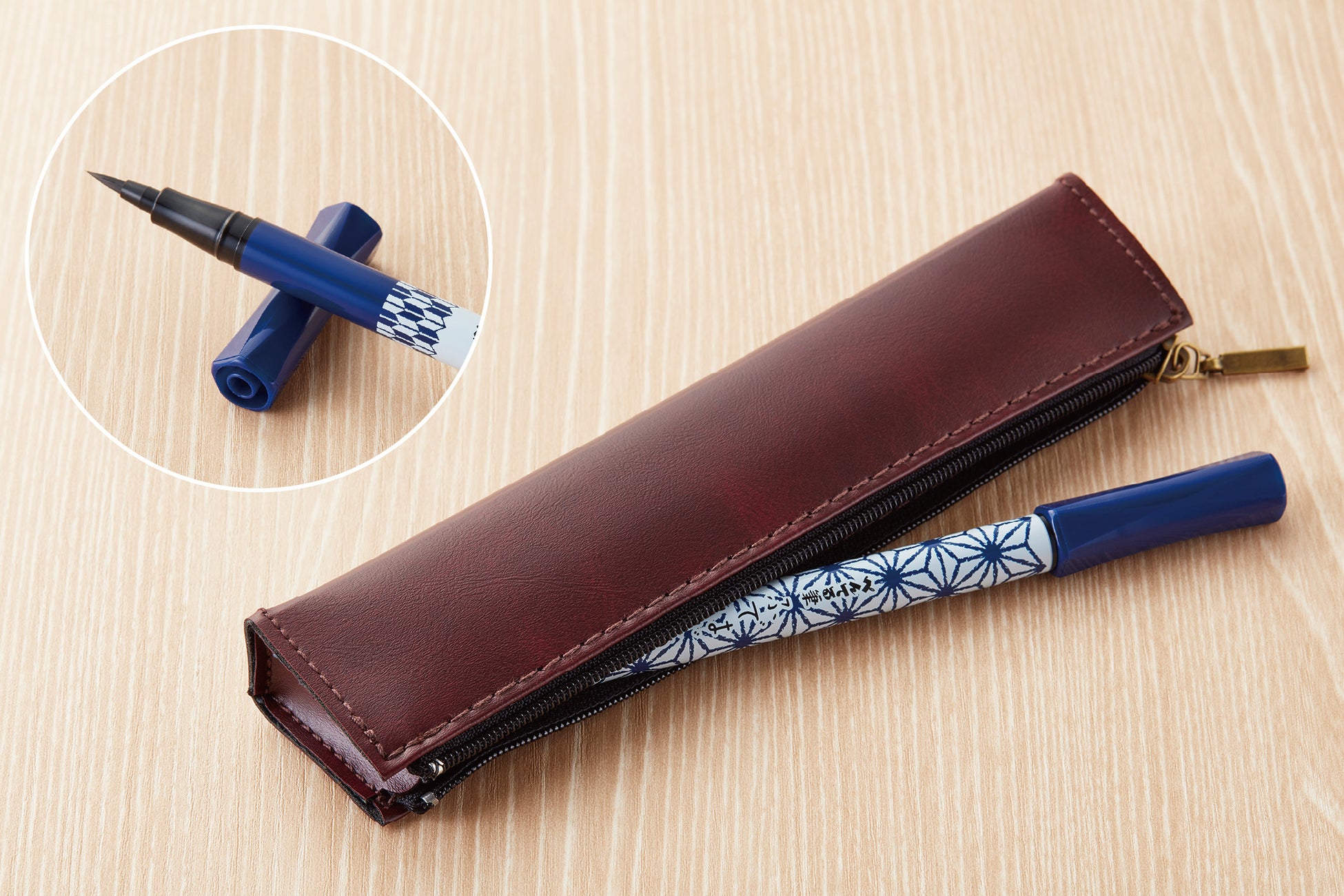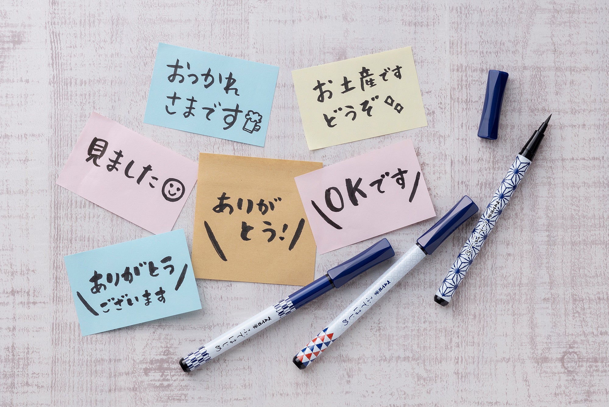 ボディはペンケースにも入るコンパクトサイズで、モダンな和柄デザインを施しています。インキは、書いたあとすぐに触れても汚れない速乾染料タイプです。
