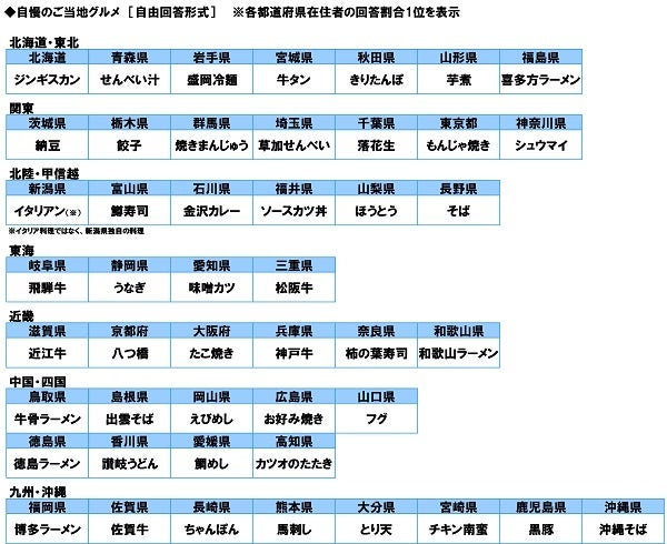 各都道府県の在住者(各都道府県100名)に、自県の自慢のご当地グルメを聞いたところ、北海道では「ジンギスカン」、宮城県では「牛タン」、秋田県では「きりたんぽ」、群馬県では「焼きまんじゅう」、埼玉県では「草加せんべい」、東京都では「もんじゃ焼き」、新潟県では「イタリアン(※)」、石川県では「金沢カレー」、福井県では「ソースカツ丼」、岐阜県では「飛騨牛」、愛知県では「味噌カツ」、三重県では「松阪牛」、滋賀県では「近江牛」、奈良県では「柿の葉寿司」、和歌山県では「和歌山ラーメン」、鳥取県では「牛骨ラーメン」、岡山県では「えびめし」、徳島県では「徳島ラーメン」、香川県では「讃岐うどん」、福岡県では「博多ラーメン」、大分県では「とり天」、宮崎県では「チキン南蛮」といった回答がありました。(図4)