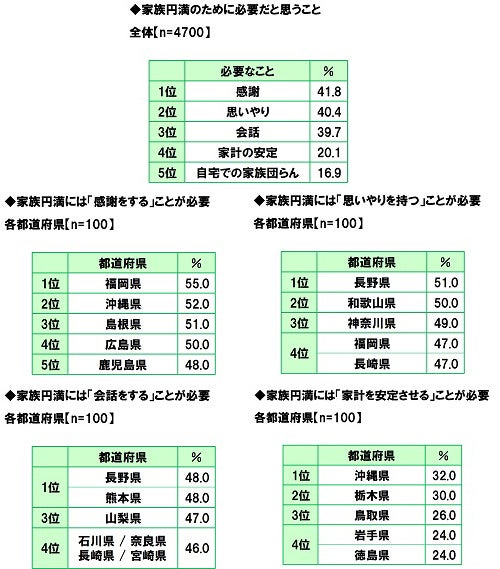 “会話をすることが必要”1位「長野県」「熊本県」、“家計を安定させることが必要”1位「沖縄県」