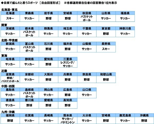 各都道府県の在住者(各都道府県100名)に、現在住んでいる都道府県で盛んだと思うスポーツを聞いたところ、自県に本拠地を置くJリーグ所属のサッカークラブがある茨城県や埼玉県、千葉県、神奈川県、静岡県などでは「サッカー」が1位となりました。また、自県に本拠地を置くプロ野球の球団がある宮城県や東京都、愛知県、大阪府、兵庫県、広島県、福岡県などでは「野球」が1位でした。そのほか、北海道と長野県では「スキー」、秋田県や富山県などでは「バスケットボール」、三重県では「レスリング」、熊本県では「バドミントン」が1位でした。(図11)