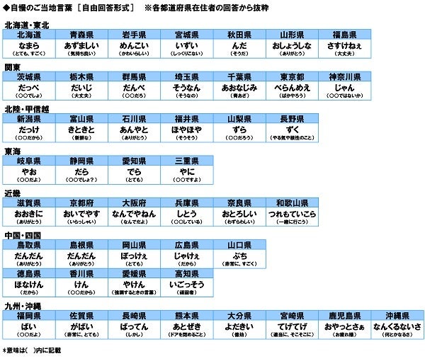 茨城県「だっぺ」、埼玉県「そうなん」、新潟県「だっけ」、富山県「きときと」、石川県「あんやと」、福井県「ほやほや」、山梨県「ずら」、静岡県「だら」、三重県「やに」、京都府「おいでやす」、奈良県「おとろしい」、和歌山県「つれもていこら」、岡山県「ぼっけぇ」、広島県「じゃけぇ」、福岡県「ばい」、佐賀県「がばい」、宮崎県「てげてげ」、鹿児島県「おやっとさぁ」、沖縄県「なんくるないさ」