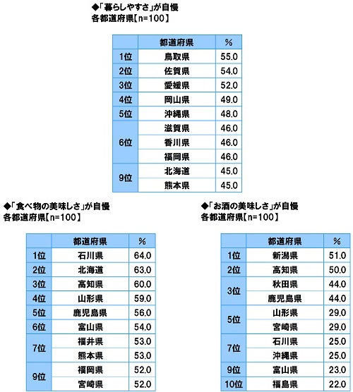【暮らしやすさ自慢】のランキングをみると、1位「鳥取県」(55.0%)、2位「佐賀県」(54.0%)、3位「愛媛県」(52.0%)となりました。鳥取県は前回調査の26位から、佐賀県は前回調査の31位から大幅にランクアップしました。(図1)