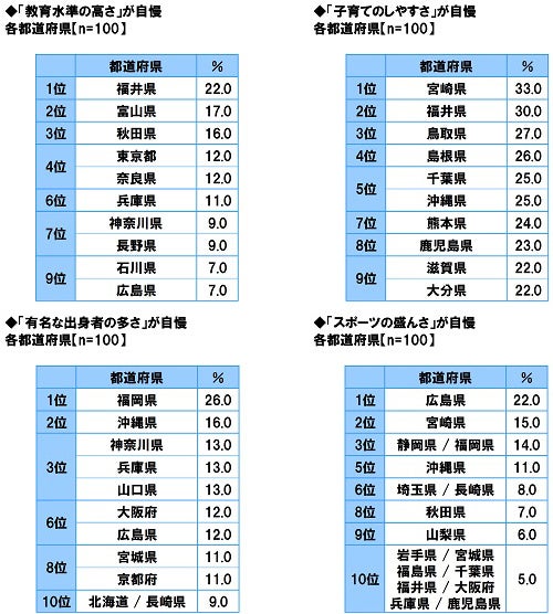 教育や子育てについてみると、【教育水準の高さ自慢】では、1位「福井県」(22.0%)、2位「富山県」(17.0%)、3位「秋田県」(16.0%)となり、福井県は2年連続1位となりました。(図5)