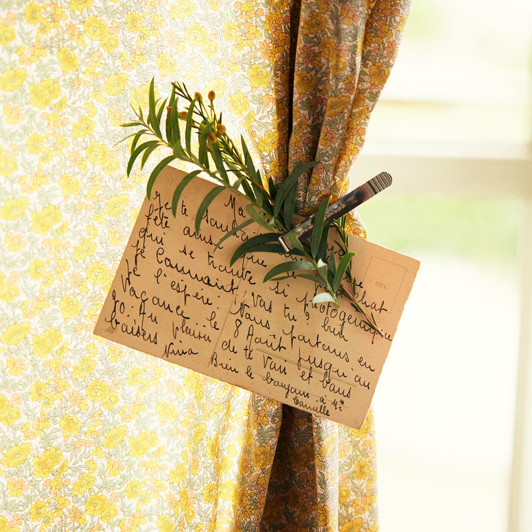 カーテンにお気に入りのポストカードと植物を一緒にピンで挟むとアクセントに。