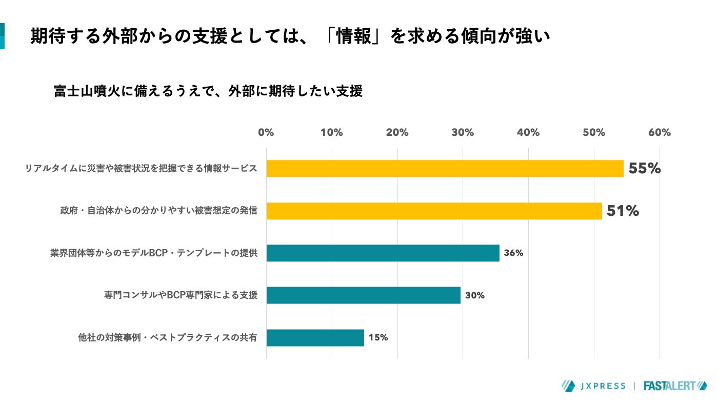 富士山噴火の対策として、期待する外部の支援を聞くと、「被害状況を把握できる情報サービス(55%)」や「政府・自治体の被害想定の発信(51%)」など、「情報」を求める傾向が強いことがわかりました。