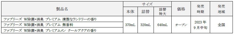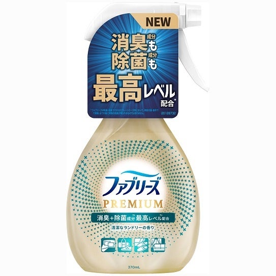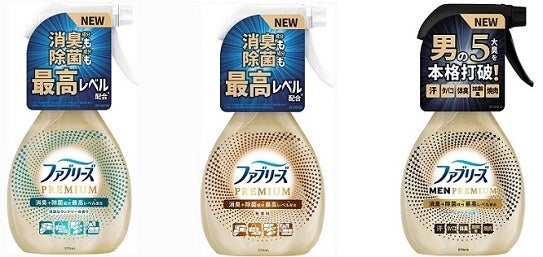 「ファブリーズ W除菌+消臭 プレミアム」は、優しく爽やかに香る「清潔なランドリーの香り」と、様々なアイテムにご使用していただきやすい「無香料」の2種類の香りと、 男の5大臭にも効果を発揮する「ファブリーズ W消臭+除菌 プレミアムメン クールアクアの香り」を含む、3種類のラインナップで販売いたします。