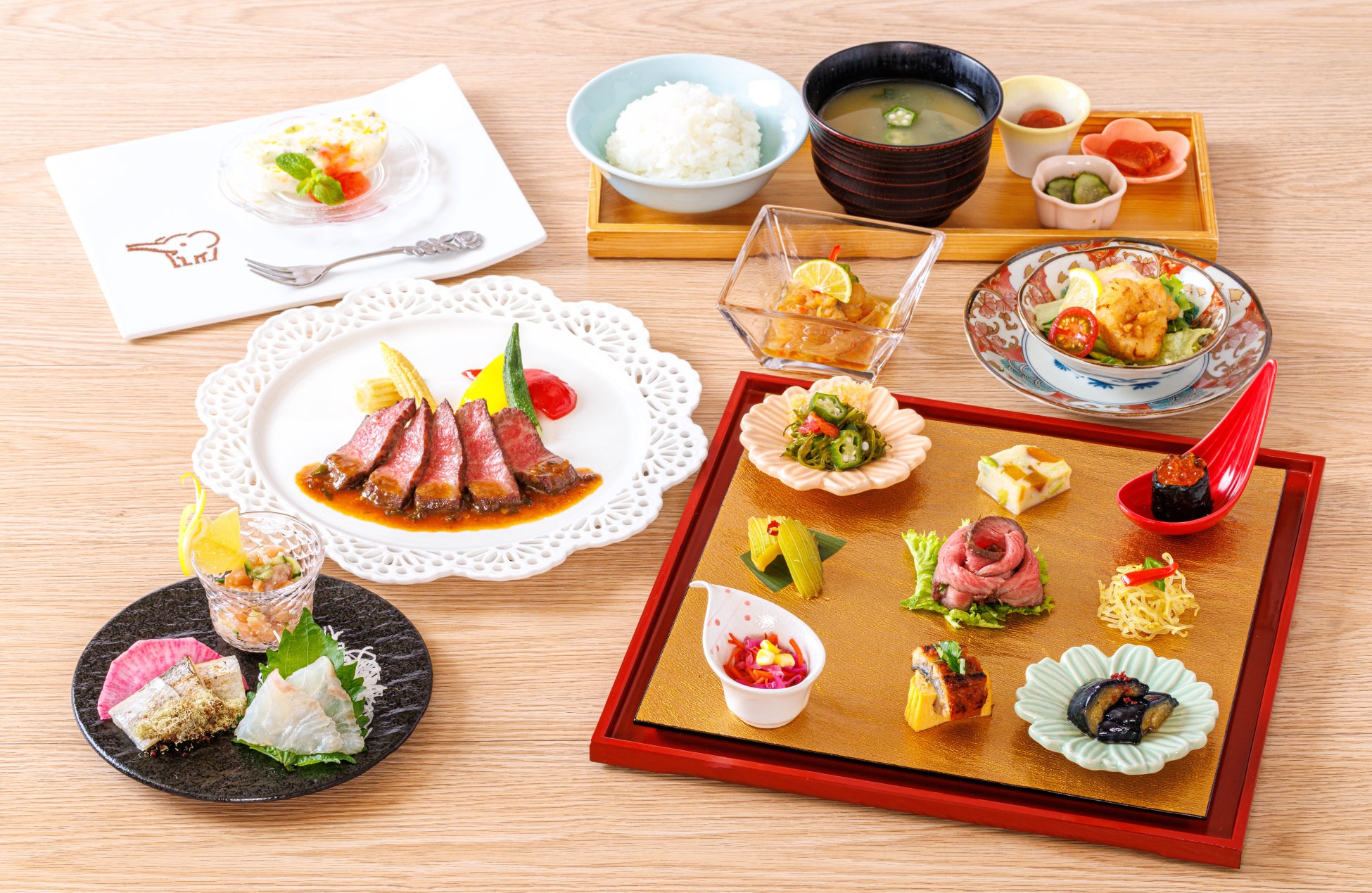 前菜9種ちょっと盛りをはじめ、3種の刺身、はもの南蛮漬けに、黒毛和牛のステーキなど、華やかで贅沢な料理をご用意しました。メインの黒毛和牛のステーキは、ジューシーに焼き上げたお肉の旨みを青唐味噌ソースがピリッと爽やかに引き立てる贅沢な一皿です。また、夏姫会席でしか味わえないぞうさんデザート~米粉と桃のフローズンケーキ~は、桃の甘みと、ひんやりとした口どけが夏の暑さを忘れさせる見た目にも爽やかなデザートです。