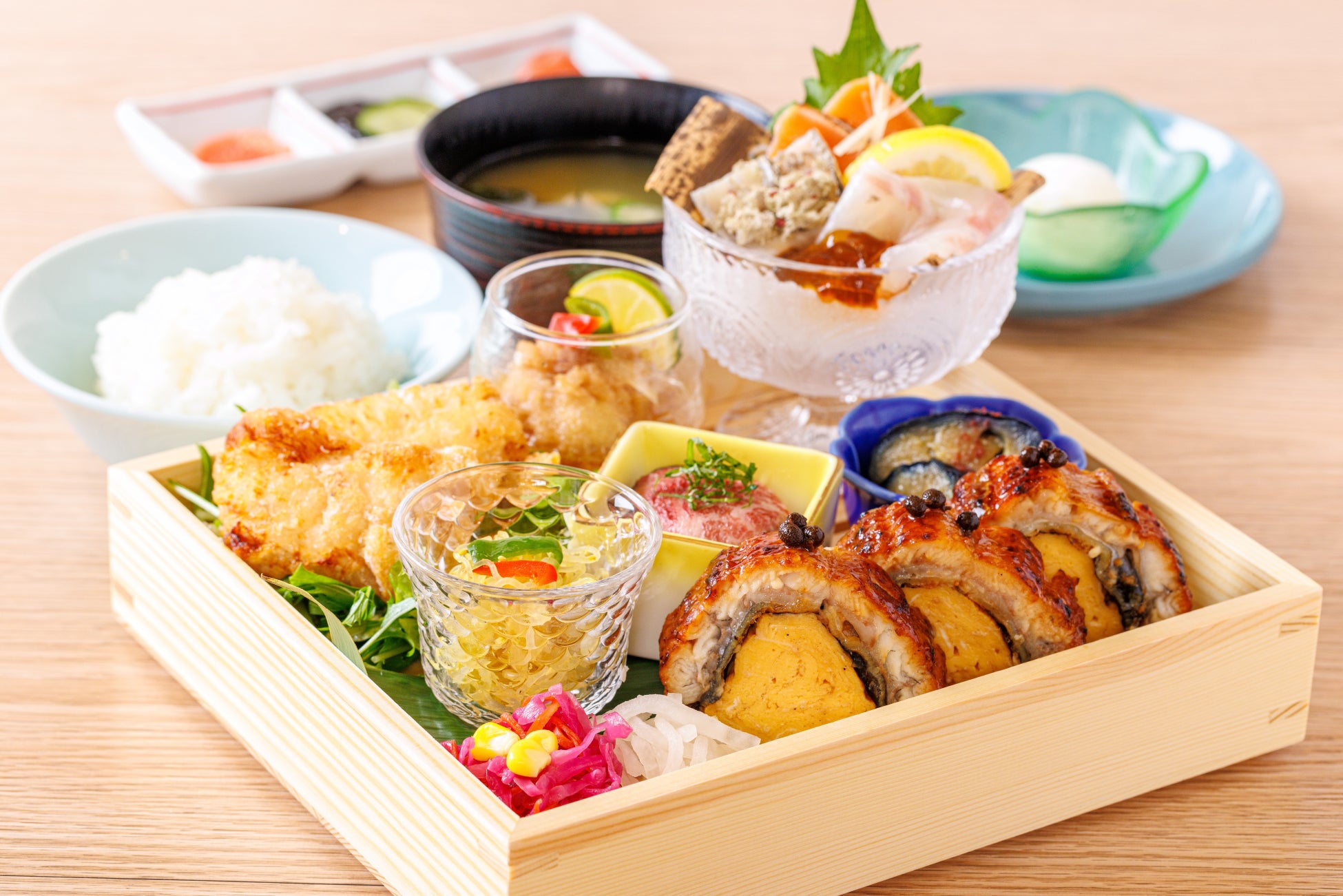 大阪本店限定の新メニューが登場。鰻を贅沢に使用した鰻のだし玉子巻きをはじめ、当店自慢の逸品を丁寧に盛りつけました。さっぱりとした味付けのおかずも用意し、暑い夏にもぴったり。色とりどりの食材が織りなすハーモニーは目で見て美しく、味わって感動をお届けします。贅沢なひとときをご堪能くださいませ。