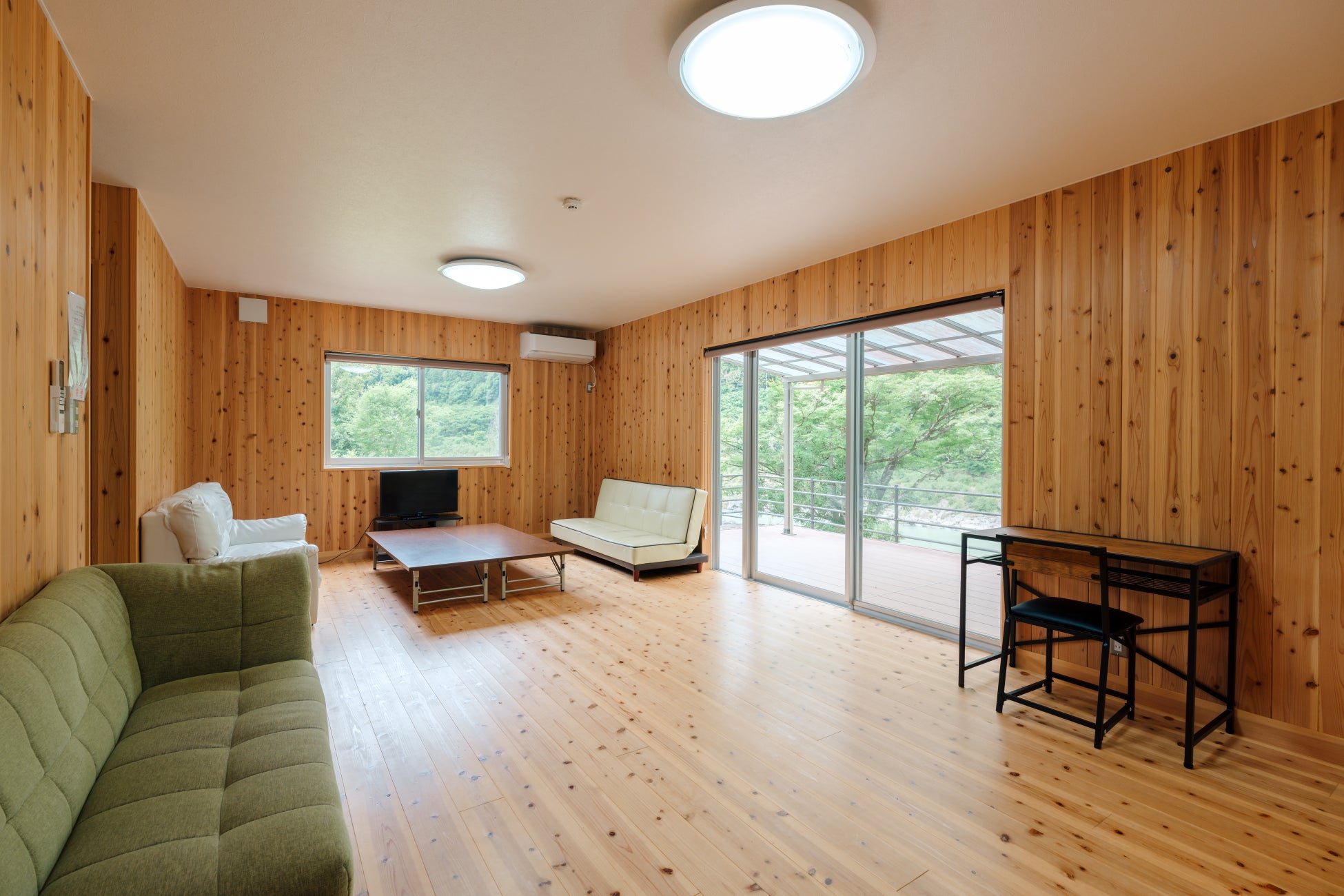 那賀町の保育園留学では、子育て家族のライフスタイルに応じた2つの宿泊施設を用意しています。キャンプ場内にあるコテージ1棟貸しの「わじきラインキャンプ村(梟)」では、プライベート感を重視した広々としたリビングと眺望の良いテラスをもち、家族でアウトドアを楽しめます。一方、「料理旅館ゆり野」では、朝食がセットになったプランもあり滞在中は家事から解放され、ゆったりとした時間を過ごすことができます。
