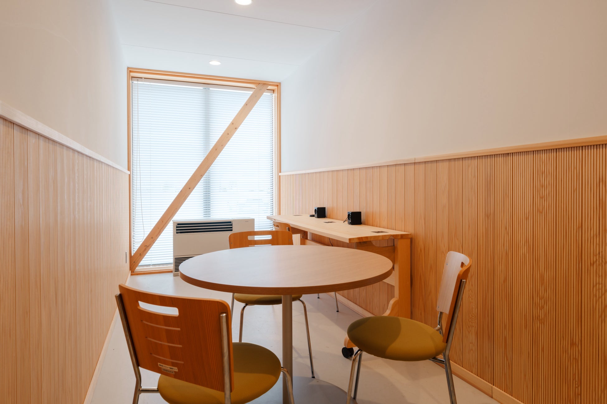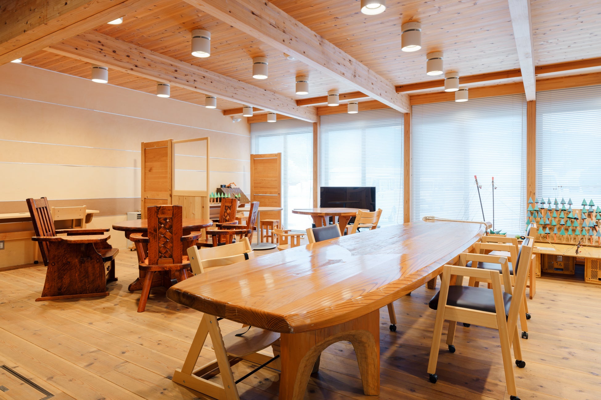 コワーキングスペースとして利用できる「林業ビジネスセンター」は、天井が高く広々とした木の温もりにあふれる空間です。また、同じフロアには子どもが遊べる「木育ひろば」も設置されています。