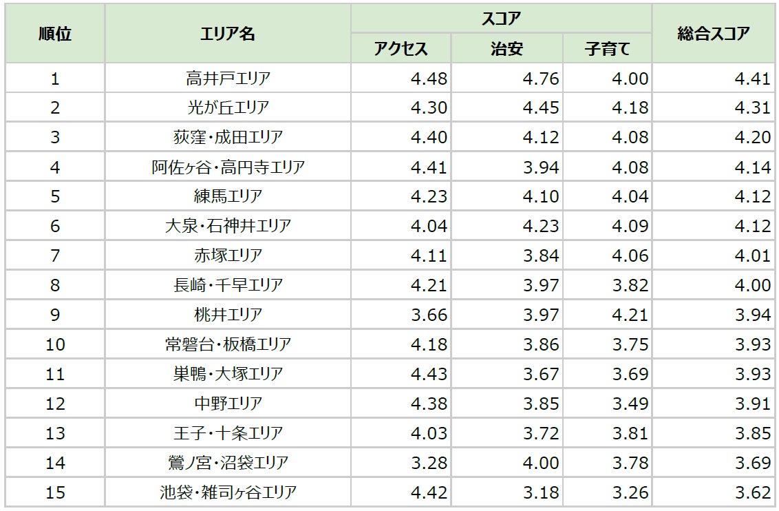 大泉・石神井エリアは総合ランキングでは練馬エリアと並列、阿佐ヶ谷・高円寺エリアには0.02ポイントという僅差でランキング外になってしまっていました。子育てスコアのみを集計したランキングでは3位にランクインしています。ここもおそらく交通の利便性でスコアに差が生じたものと思われます。西武池袋線を利用することができるのですが、大泉学園駅など、駅によっては急行電車が停車しない場合があるため、不便さを感じる時が多々あるとユーザー様からコメントをいただいております。