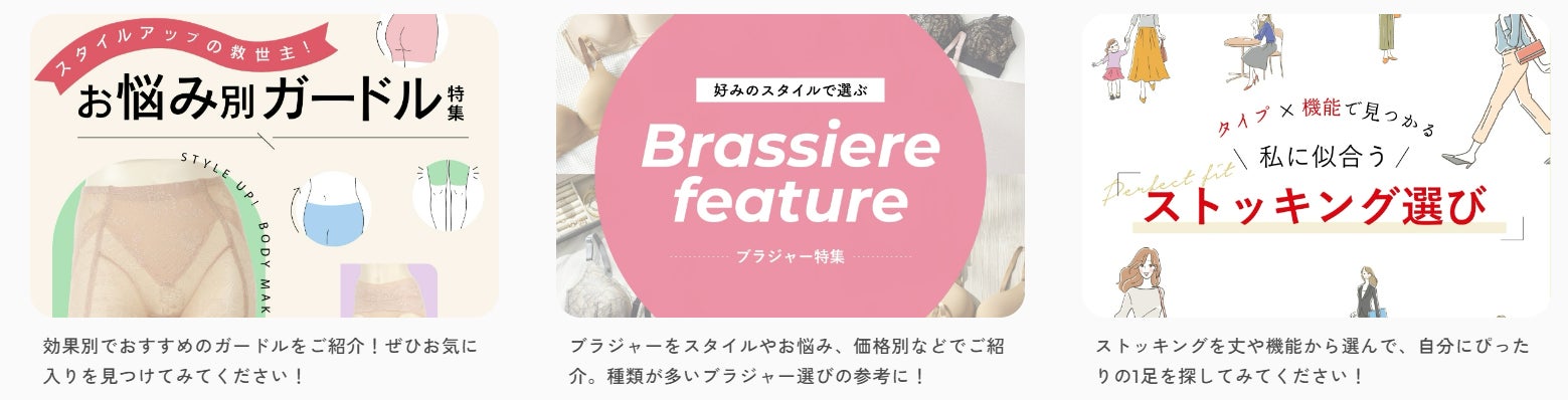 商品選びをお手伝いする、メーカー直営オンラインショップならではのコンテンツを掲載しています。インナーウェアやレッグウェアに関するお悩みを解消し、新しいお気に入りアイテムに出会うきっかけが盛りだくさんです。