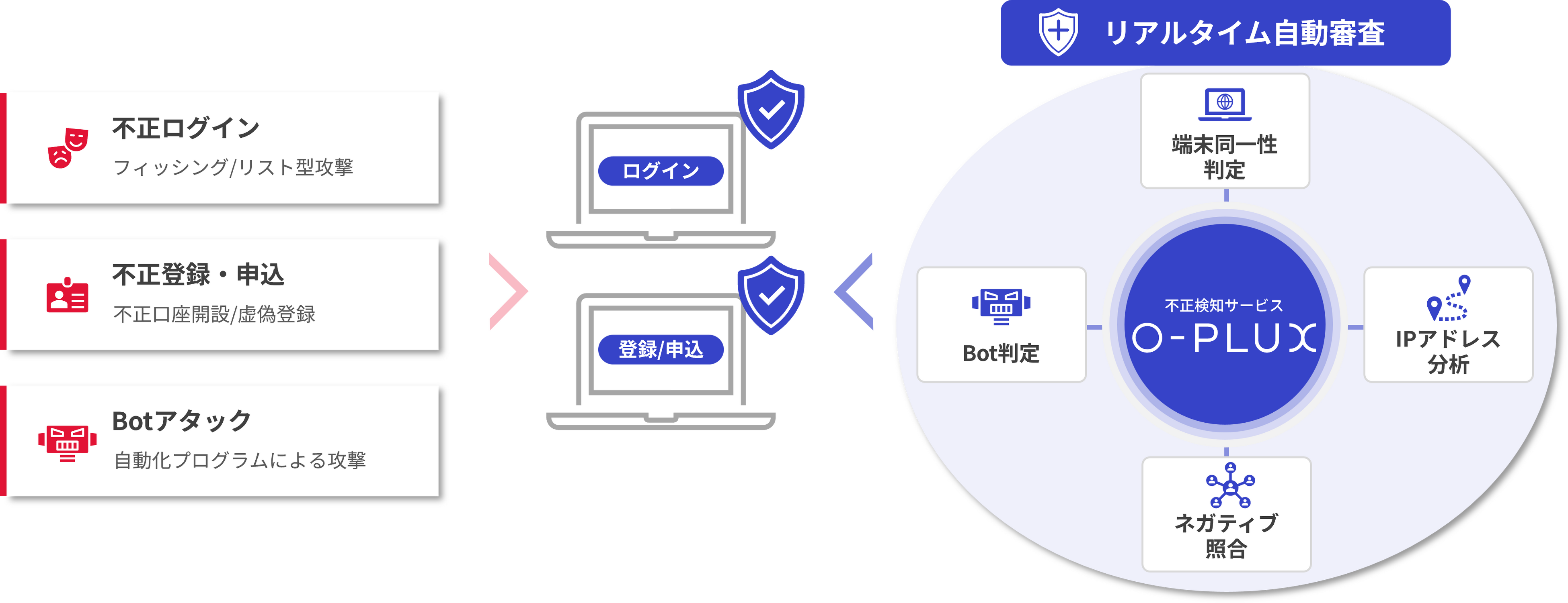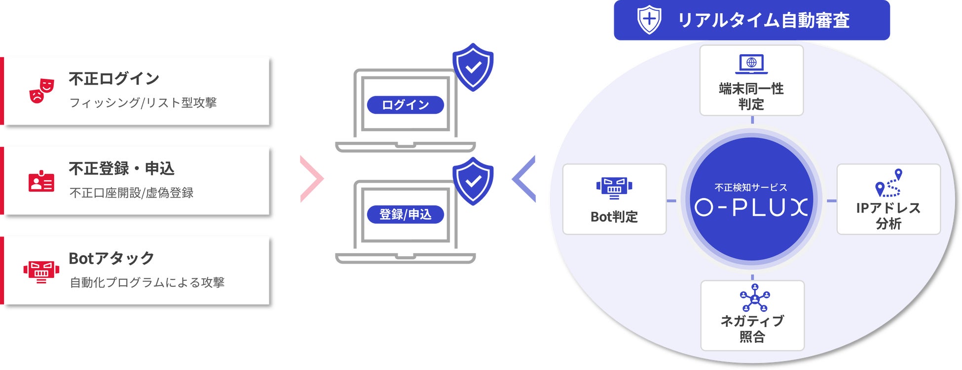 Caccoが提供する不正検知サービス「O-PLUX」は、「ログイン画面」「登録/申込画面」への「不正ログイン」「不正会員登録/口座開設/申込」「Botアタック」を検知/モニタリングするためのクラウドサービスです。