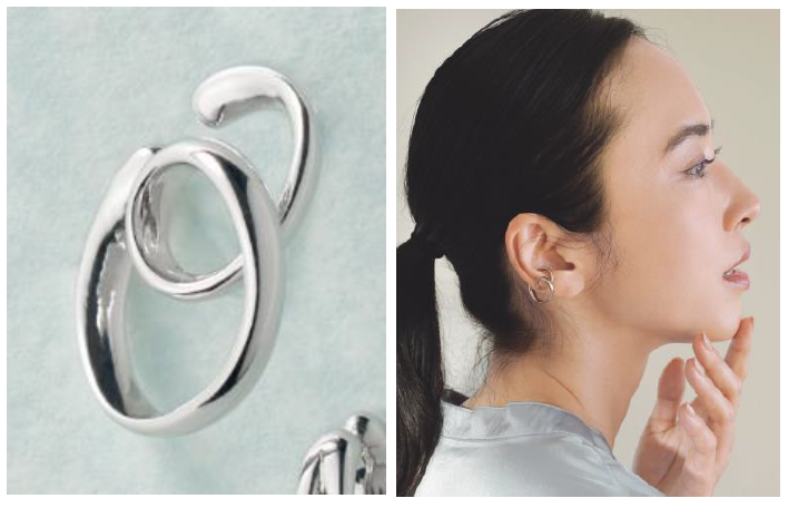 2つのサークルを異なる印象に重ね合わせた、艶やかに輝くイヤーカフ2種。片耳に着けるだけで大人女性の顔まわりを明るく彩ります。