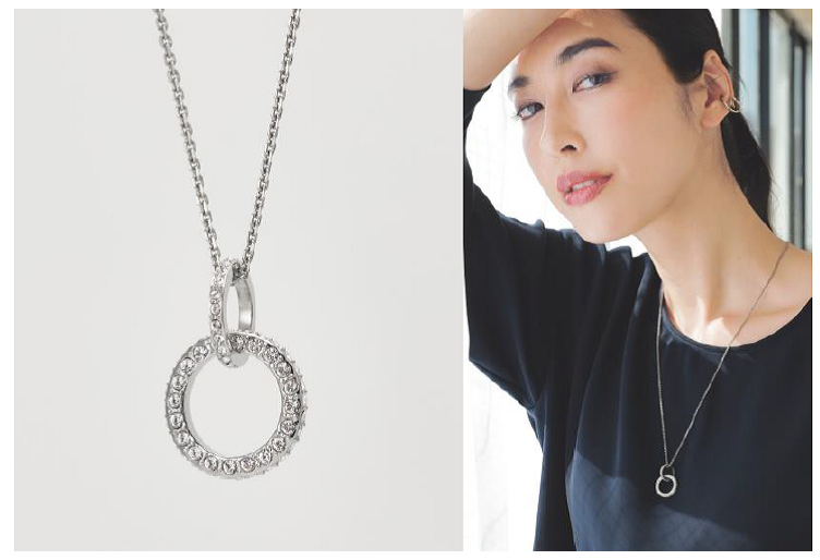 クリスタルをあしらった2連サークルの2種のデザインが、まばゆい煌めきを放ち大人女性の胸もとを上質に彩ります。