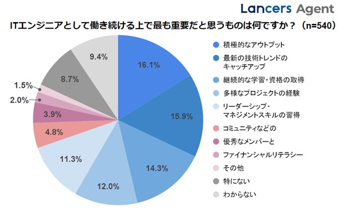 『Lancers Agent(ランサーズエージェント)』が実施したITエンジニア(※1)を対象とした調査では、ITエンジニアにとって、学びの機会が不足していることが大きな課題であることがわかりました。「ITエンジニアとして働き続ける上で最も重要だと思うもの」という質問に対して、「最新技術トレンドのキャッチアップ」や「継続的な学習・資格の取得」が上位に挙げられ、ITエンジニアが日々の学びを重視し、スキル向上に対して高い意識を持っていることが見受けられます。