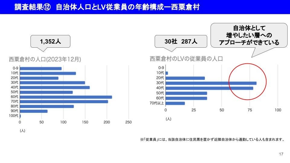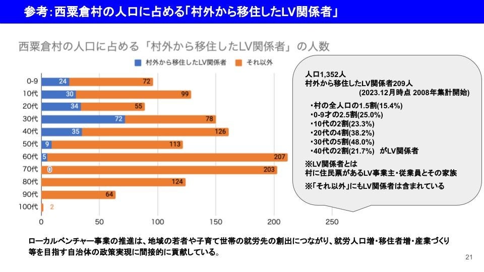 また、本協議会の幹事自治体である岡山県西粟倉村では、ローカルベンチャーの従業員にその家族を加えて「LV関係者」と定義した上で、村人口の各年代に占める「村外から移住したLV関係者」の割合を集計しており、参考情報としてそのデータも掲載しました。