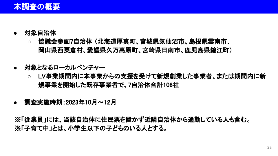 ローカルベンチャー協議会参画の7自治体 (北海道厚真町、宮城県気仙沼市、島根県雲南市、岡山県西粟倉村、愛媛県久万高原町、宮崎県日南市、鹿児島県錦江町)のローカルベンチャー108社を調査