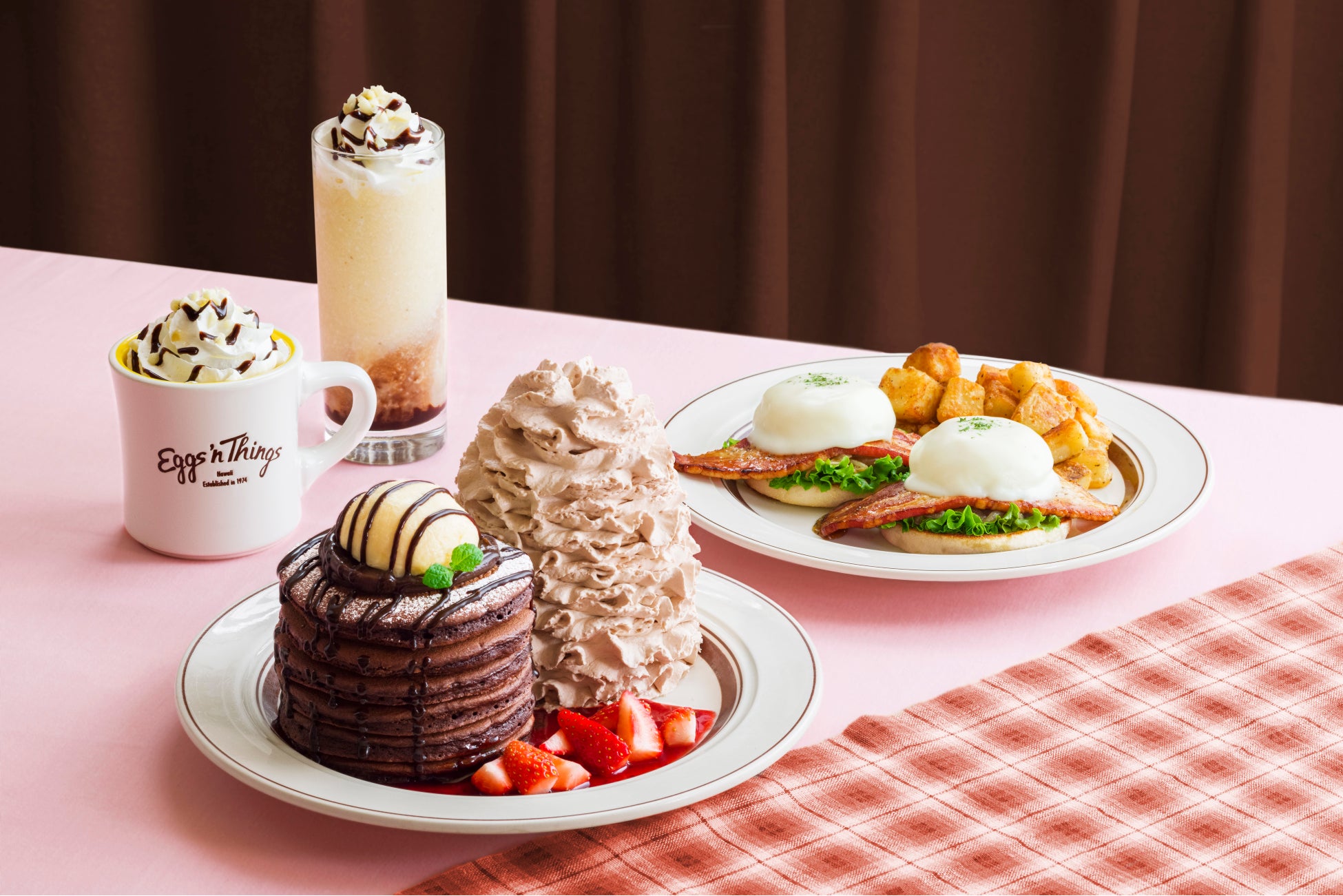 Eggs ’n Thingsよりチョコレートホイップクリームを添えたバレンタイン限定メニューが登場!「フォンダンショコラ&ストロベリーパンケーキ」「イベリコ豚のメープルベーコン・エッグスベネディクト」