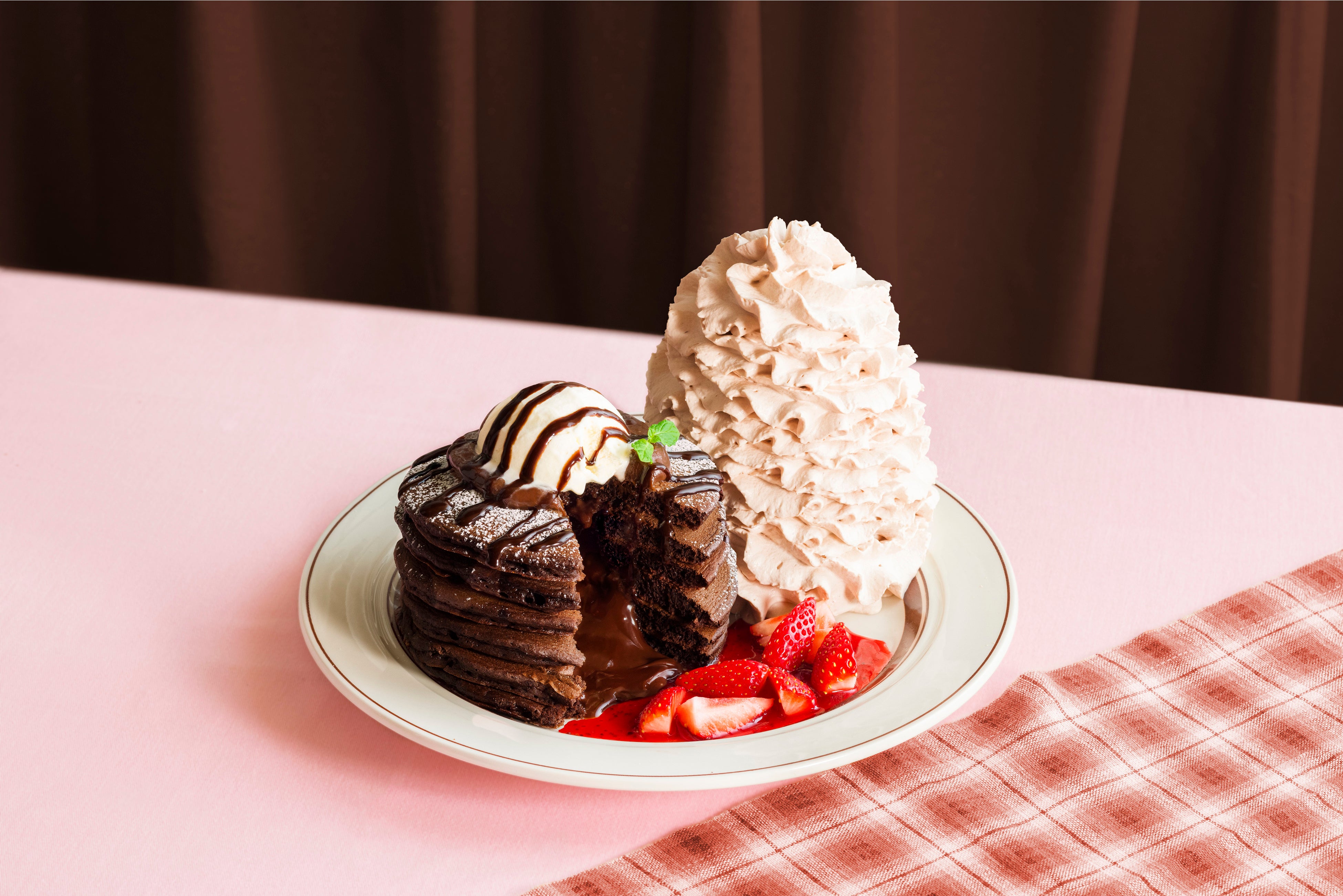 しっとりとしたココア生地のパンケーキからたっぷりのチョコレートガナッシュが溢れ出す『フォンダンショコラ&ストロベリーパンケーキ』の横には、くちどけ軽やかなチョコレートホイップクリームを添えて一皿で存分にチョコレートをお楽しみいただけるよう仕上げました。チョコレートと相性の良いイチゴとバニラアイスクリームと一緒にお召し上がりください。