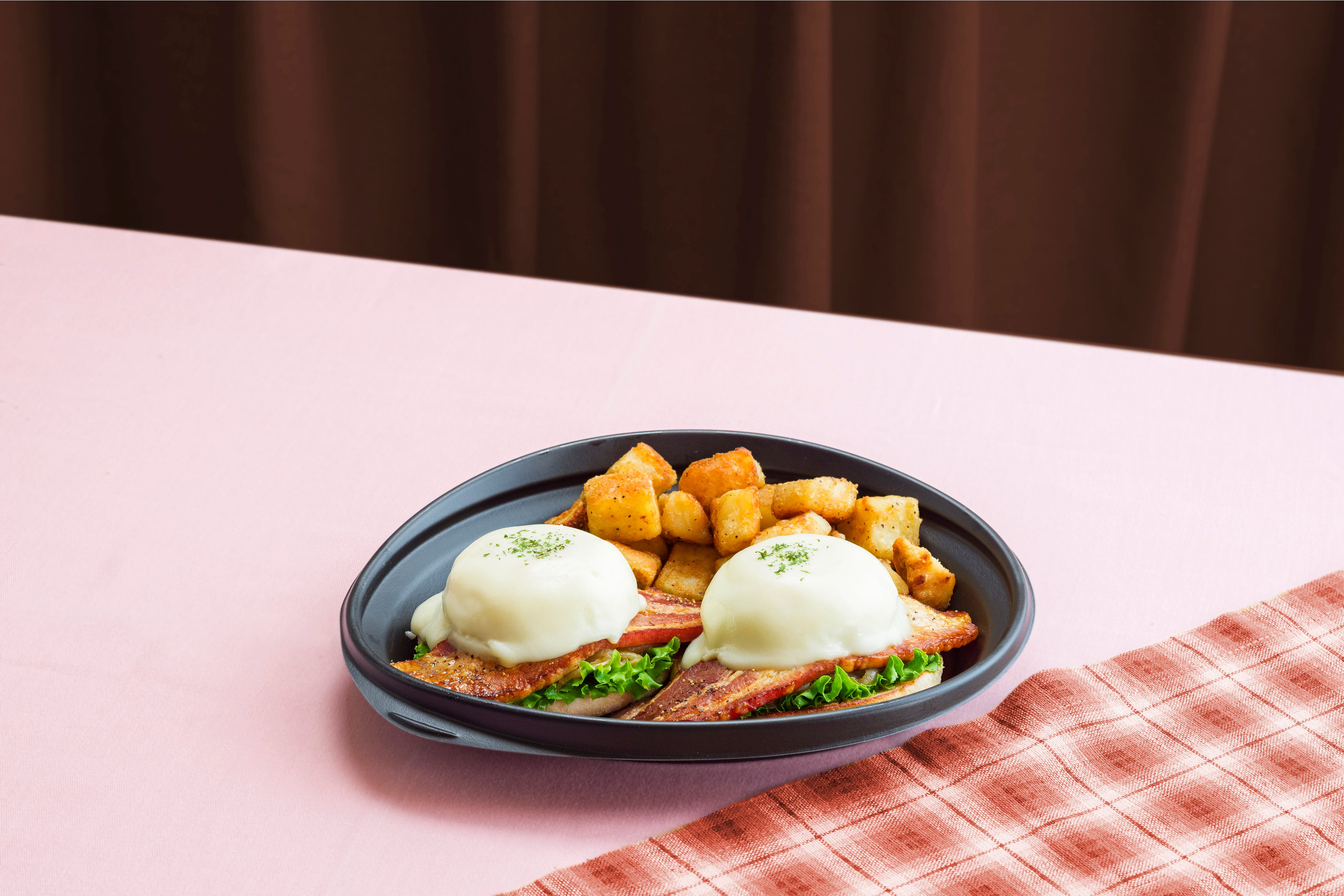 チーズソースをかけたエッグスベネディクトでお楽しみください