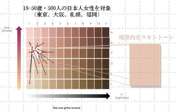 研究の結果、日本女性は、チャート上では、「C2」にある理想的なスキントーンを