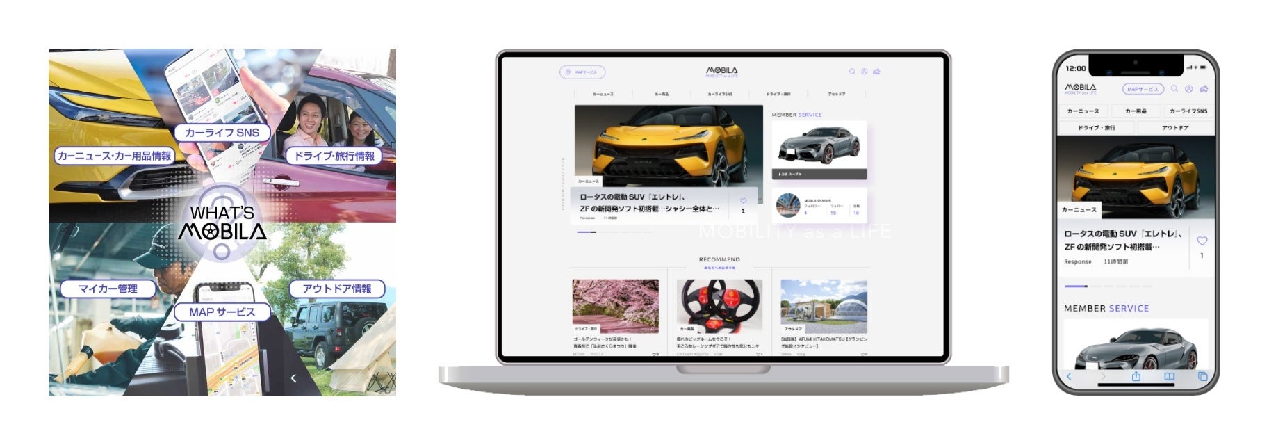 FUNQコンテンツの提供先である「MOBILA」は最新のカーニュース、ドライブやアウトドアなどクルマで出かけたくなる情報と、マイカーのメンテナンス管理などの便利な機能を搭載したカーライフ総合情報サイトとして、「クルマで出かける楽しさ」を提案しています。