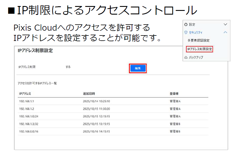 あらかじめ許可したIPアドレスからのみアクセスを可能とすることで、