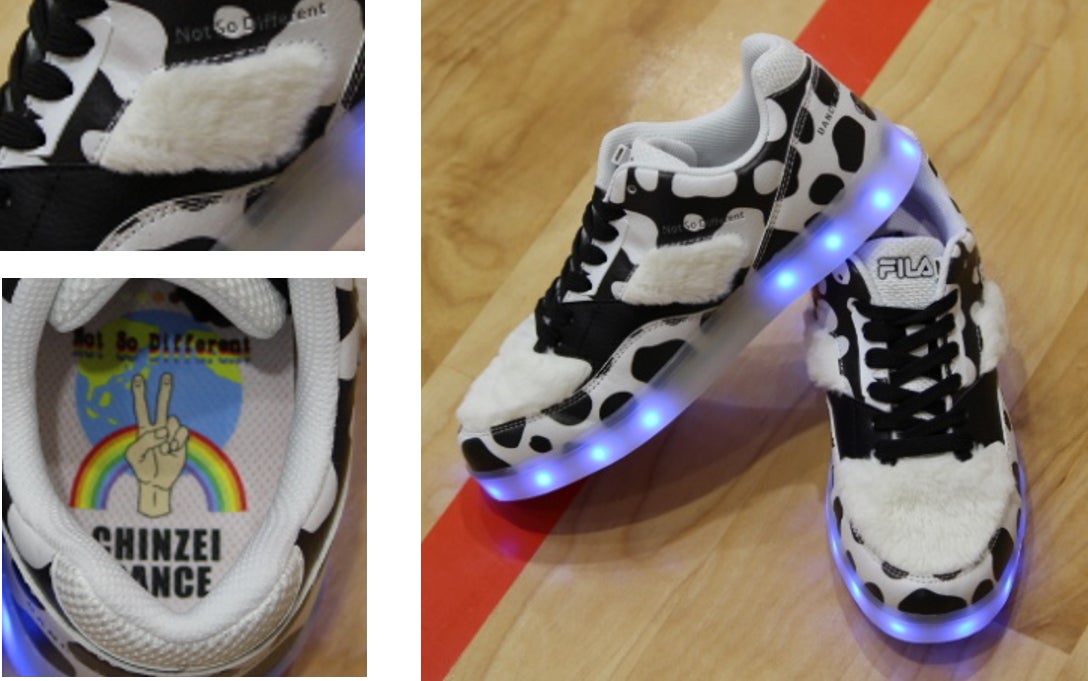 今回の賞品であるオリジナルダンスシューズは、部員全員でアイデアを出し合ったデザインで、モノクロのアニマル風モチーフが全面にあしらわれ、ダンスシューズには珍しいフェイクファーを施したアッパーのふわふわ感が、自分たちだけのオリジナリティとしてこだわったポイントです。またインソールには、ダンス部の目標であるテーマ「Not So Different」がプリントされています。赤・緑・青・黄・水色・紫・白の7パターンの色と、4パターンに点滅するLEDが仕込まれた特別な一足となっており、「世界にひとつしかないオリジナルダンスシューズ」として製作されました。