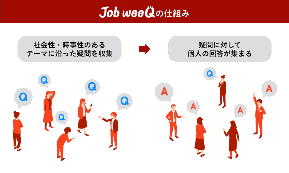 『Job weeQ』とは、リアルなはたらく疑問(”Job”のQ)が集まる期間(ウィーク)です。さまざまな世代の価値観や多様なキャリアを持つユーザーから疑問や悩みを集め、それに対する個人の回答も収集する、ユーザー参加型の企画です。