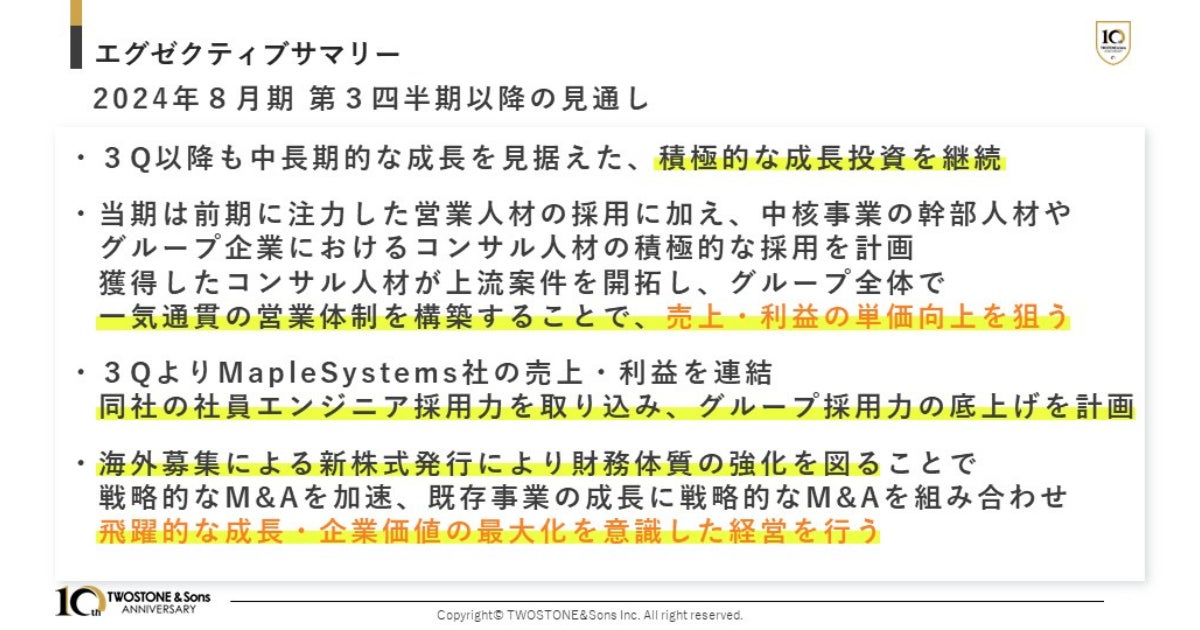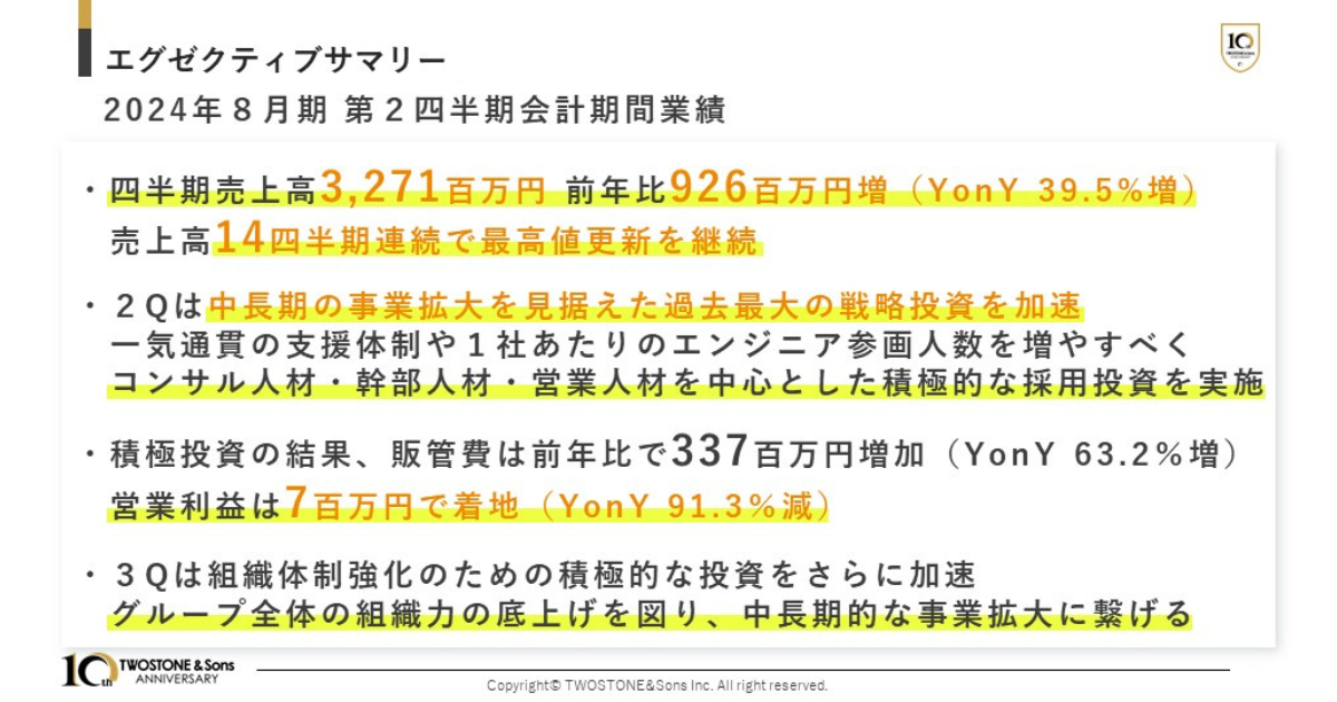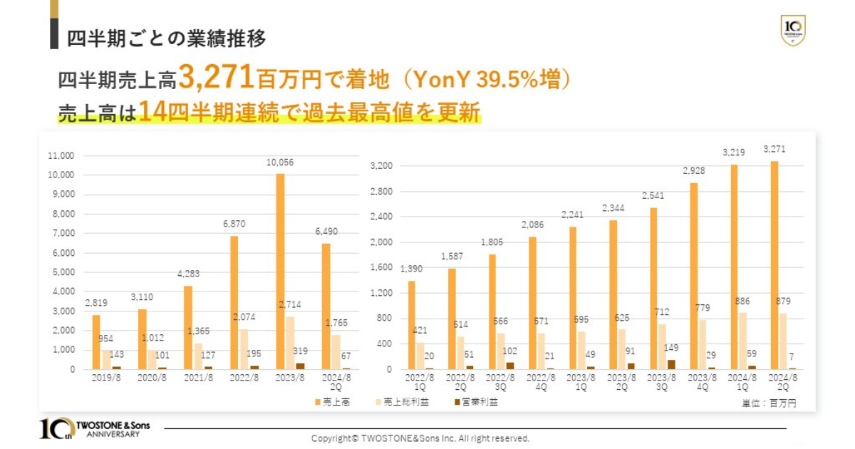 TWOSTONE&Sons 2024年8月期 第2四半期決算発表 海外募集による新株式発行・中長期を見据えた投資を加速、売上高14四半期連続最高値