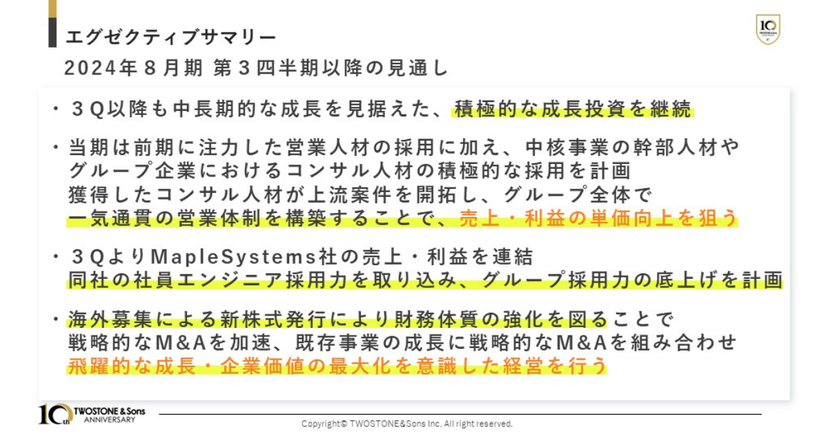 また第3四半期より、2024年2月にM&Aを実施した株式会社MapleSystems(以下 MapleSystems)の売上・利益を連結いたします。MapleSystemsの社員エンジニア採用力を当社グループへ取り込むことで、グループ全体の採用力の底上げを計画しております。また、MapleSystemsのエンジニアが活躍することで顧客の課題解決の幅も広がるため、様々な場面での貢献に繋がると考えております。