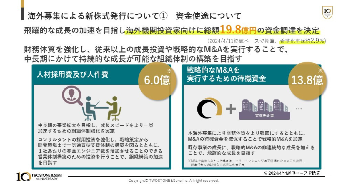 飛躍的な成長を加速させるため、海外市場からの資金調達を決定いたしました。財務体制を強化し、従来以上の成長投資や戦略的なM&Aを実行することで、中長期にかけて持続的な成長が可能な組織体制の構築を目指してまいります。なお本海外募集による当社株式の希薄化は約2.9%であります。