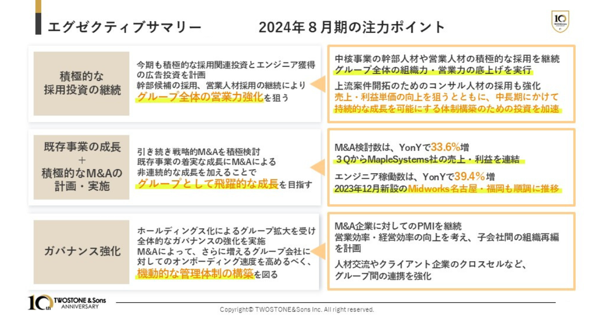 2024年8月期は「積極的な採用投資の継続」「既存事業の成長および積極的なM&Aの計画・実施」「ガバナンス強化」の3点を注力ポイントに掲げております。