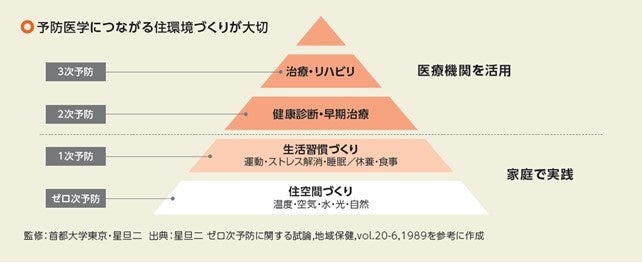 病気になってから治療するのではなく、「病気にかからないよう予防する」ことを「予防医学」といいます。年齢を重ねても心身ともに健康で生きたいというのは、多くの人が願うところでしょう。そこで欠かせないのが「ゼロ次予防」で、いわゆる住空間づくりが該当します。温度や空気、水、光、自然といった、基礎になる住環境を整えることで、長期にわたって心身の健康が維持できるという考え方です。
