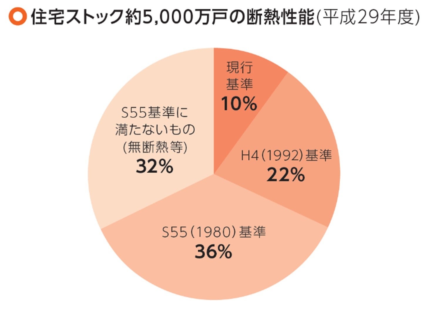 欧州をはじめ、世界各国では高い基準を定め、住まいの断熱性、省エネ性を高める施策を行ってきました。しかし日本の住まいは、未だに寒いままです。国内にある既存住宅約5000 万戸のうち、現行の省エネ基準を満たしている住宅はわずか 10%にすぎません。残り90%の住まいは、夏は暑く、冬は寒い、断熱性能に乏しい住まいのままなのです。
