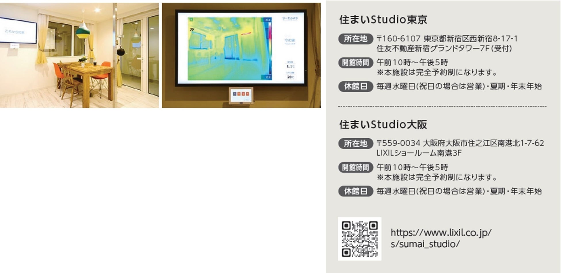 「住まいStudio」は、住宅の断熱性能の違いによる冬の室内温度の感じ方、夏の日差しを遮る方法など、快適な暮らしについて学べる体験型ショールームです。特に「Studio冬」では、施設内に冬を想定した環境条件を再現し、「昔の家(省エネルギー基準:昭和55年基準)」「今の家(省エネルギー基準:平成28 年基準)」「 これからの家HEAT20 G2」の3つの部屋があります。サッシやガラスをさわって温度の違いを体感したり、サーモグラフで温度状況を見たり。温熱環境、断熱性能を「見て」「さわって」「体感できる」施設です。