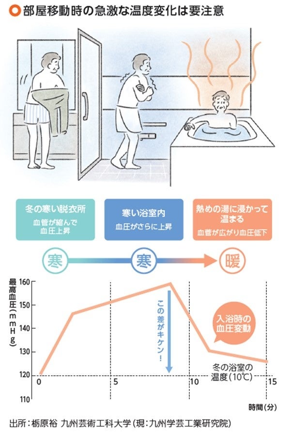 ヒートショックで気をつけるべきは、急激な温度差です。築年数が経過した断熱性能が低い家などでは、廊下などの普段過ごしていない部屋が寒くなりやすいので注意が必要です。特に、脱衣場は浴室との温度差も大きいことや、室内が寒いために早く温まろうと熱めの湯につかる場合もあることから、血圧が乱高下し、心筋梗塞や脳卒中などを引き起こしやすくなるといわれています。