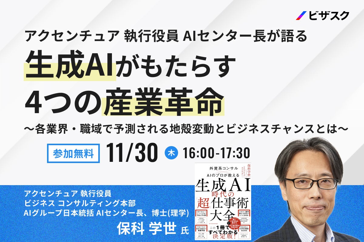【11/30(木)16時】アクセンチュア 執行役員 AIセンター長が語る生成AIがもたらす4つの産業革命無料オンラインセミナーを開催