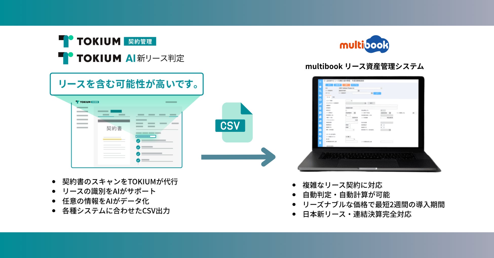 新リース会計基準対応クラウドERP「multibook(マルチブック)」を提供する株式会社マルチブック(本社:東京都品川区、代表取締役社長:渡部 学、以下「当社」)は、経理AIエージェントを提供する株式会社TOKIUM(本社:東京都中央区、代表取締役:黒﨑 賢一、以下「TOKIUM」)と連携を開始し、企業の新リース会計基準対応支援を強化したことをお知らせいたします。